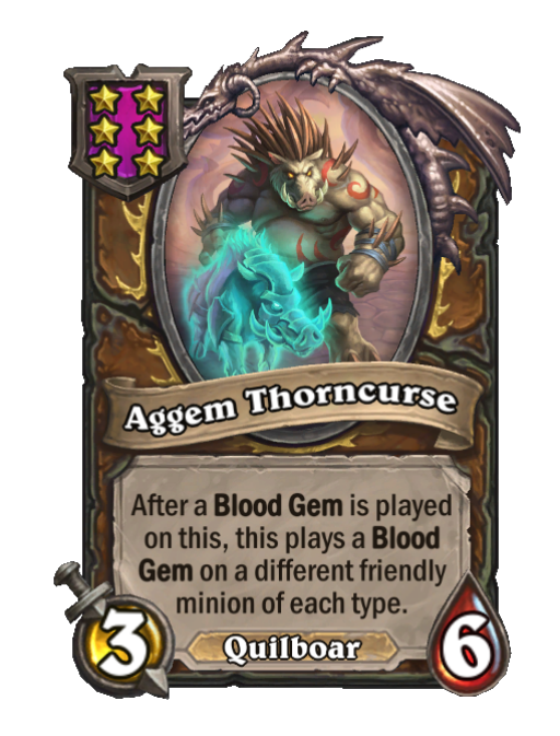 Aggem Thorncurse is a Tier 6 Quilboar Minion in Hearthstone Battlegrounds with 3/6 stats. Effect: After a Blood Gem is played on this, this plays a Blood Gem on a different friendly minion of each type. This card is no longer in the pool (Legacy).