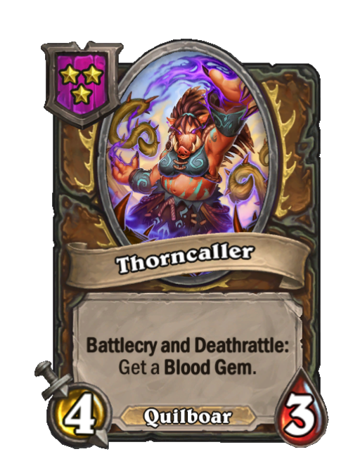 Thorncaller is a Tier 3 Quilboar Minion in Hearthstone Battlegrounds with 4/3 stats featuring Deathrattle, Battlecry. Effect: Battlecry and Deathrattle: Get a Blood Gem. This card is no longer in the pool (Legacy).