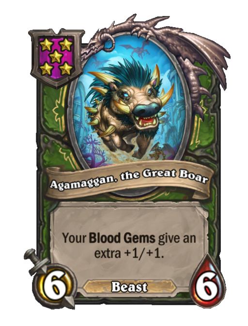 Agamaggan, the Great Boar is a Tier 5 Beast Minion in Hearthstone Battlegrounds with 6/6 stats featuring Aura. Effect: Your Blood Gems give an extra +1/+1. This card is no longer in the pool (Legacy).