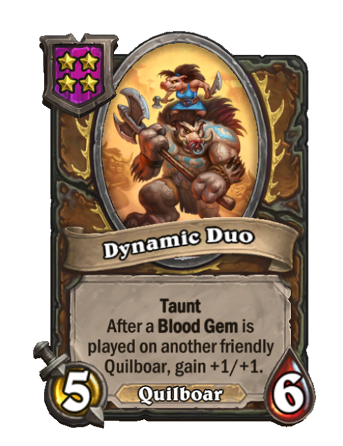 Dynamic Duo is a Tier 4 Quilboar Minion in Hearthstone Battlegrounds with 5/6 stats featuring Taunt. Effect: Taunt After a Blood Gem is played on another friendly Quilboar, gain +1/+1. This card is no longer in the pool (Legacy).