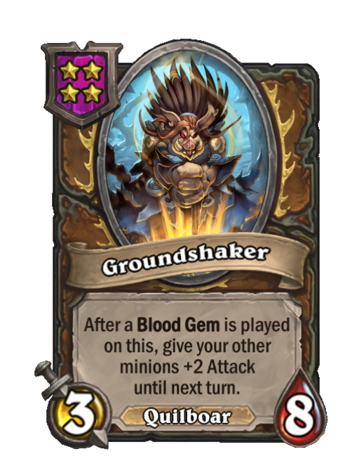 Groundshaker is a Tier 4 Quilboar Minion in Hearthstone Battlegrounds with 3/8 stats. Effect: After a Blood Gem is played on this, give your other minions +2 Attack until next turn. This card is no longer in the pool (Legacy).