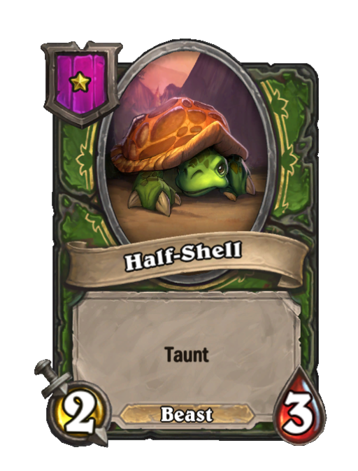 Half-Shell is a Tier 1 Beast Minion in Hearthstone Battlegrounds with 2/3 stats featuring Taunt. Effect: Taunt. Created by: Sewer Rat. This card is no longer in the pool (Legacy).