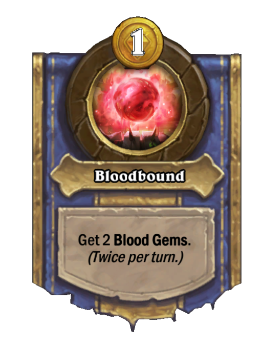 Bloodbound is a Hero Power in Hearthstone Battlegrounds. Effect: Get 2 Blood Gems. (Twice per turn.). Costs 1 Gold. Created by: Death Speaker Blackthorn.