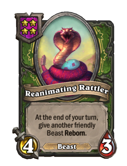 Reanimating Rattler is a Tier 4 Beast Minion in Hearthstone Battlegrounds with 4/3 stats. Effect: At the end of your turn, give another friendly Beast Reborn. This card is no longer in the pool (Legacy).