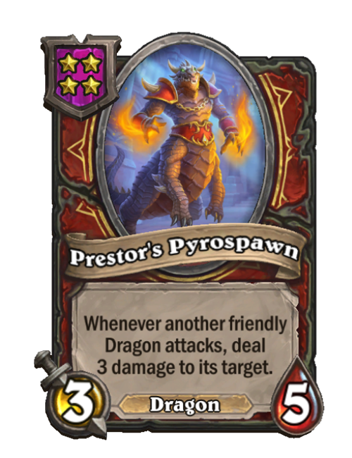 Prestor's Pyrospawn is a Tier 4 Dragon Minion in Hearthstone Battlegrounds with 3/5 stats. Effect: Whenever another friendly Dragon attacks, deal 3 damage to its target. This card is no longer in the pool (Legacy).