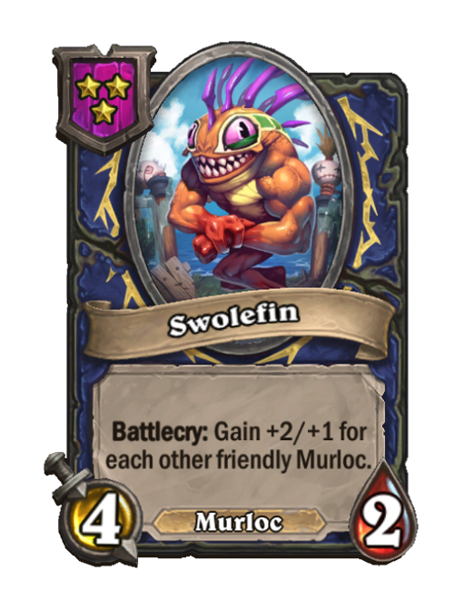 Swolefin is a Tier 3 Murloc Minion in Hearthstone Battlegrounds with 4/2 stats featuring Battlecry. Effect: Battlecry: Gain +2/+1 for each other friendly Murloc. This card is no longer in the pool (Legacy).