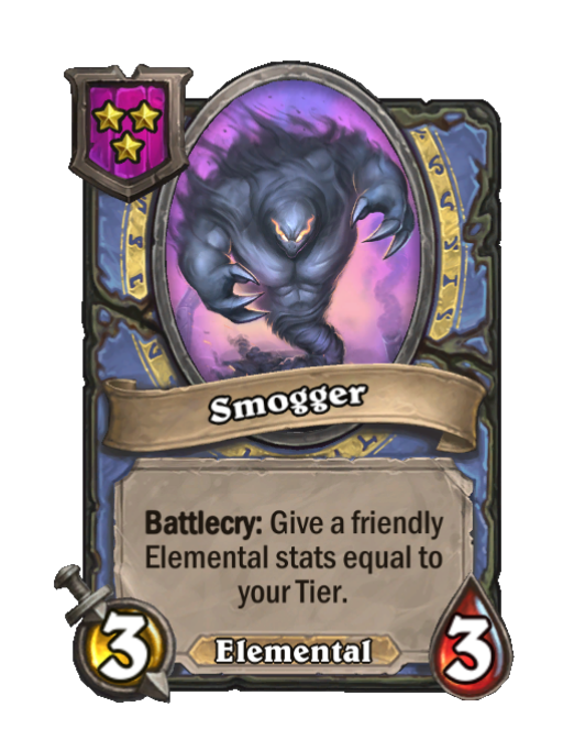 Smogger is a Tier 3 Elemental Minion in Hearthstone Battlegrounds with 3/3 stats featuring Battlecry. Effect: Battlecry: Give a friendly Elemental stats equal to your Tier. This card is no longer in the pool (Legacy).