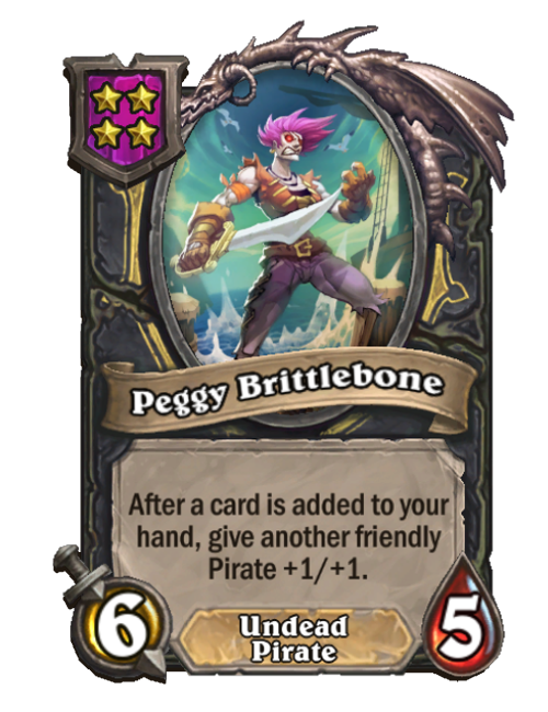 Peggy Brittlebone is a Tier 4 Pirate/Undead Minion in Hearthstone Battlegrounds with 6/5 stats. Effect: After a card is added to your hand, give another friendly Pirate +1/+1. This card is no longer in the pool (Legacy).