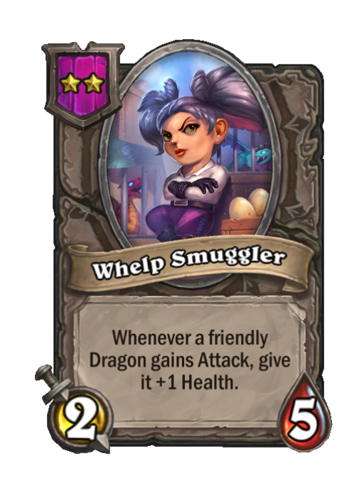 Whelp Smuggler is a Tier 2 Minion in Hearthstone Battlegrounds with 2/5 stats. Effect: Whenever a friendly Dragon gains Attack, give it +1 Health. This card is no longer in the pool (Legacy).