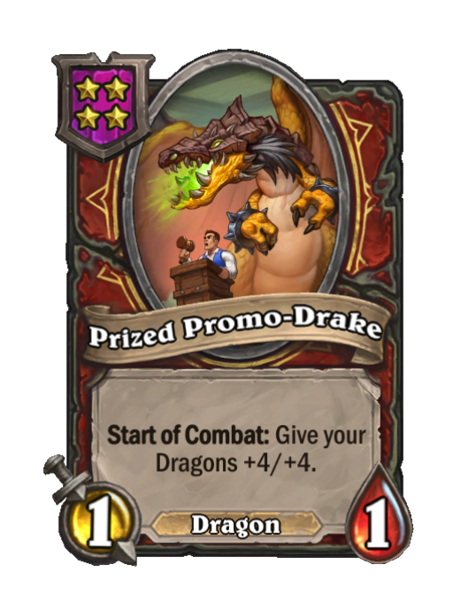 Prized Promo-Drake is a Tier 4 Dragon Minion in Hearthstone Battlegrounds with 1/1 stats featuring Start of Combat. Effect: Start of Combat: Give your Dragons +4/+4.