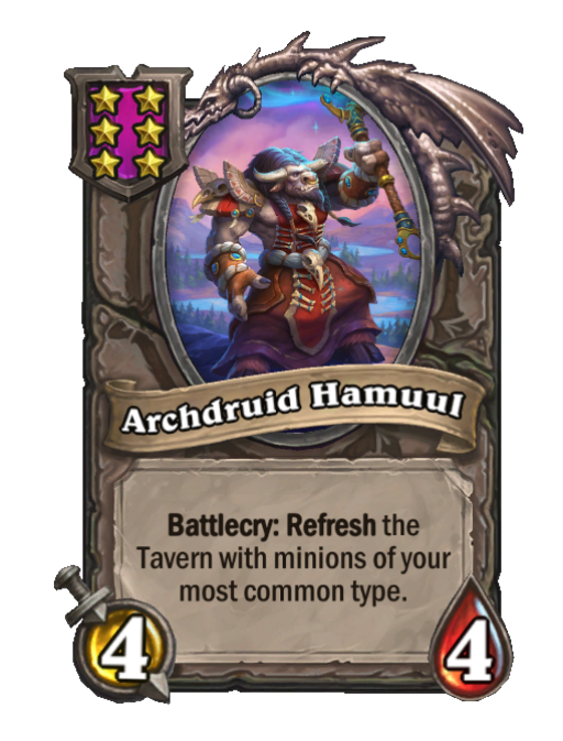 Archdruid Hamuul is a Tier 6 Minion in Hearthstone Battlegrounds with 4/4 stats featuring Battlecry, Refresh. Effect: Battlecry: Refresh the Tavern with minions of your most common type. This card is no longer in the pool (Legacy).