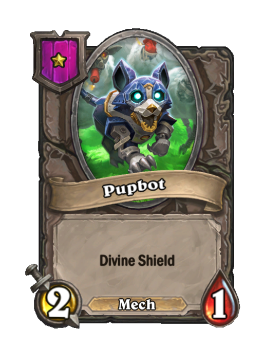 Pupbot is a Tier 1 Mech Minion in Hearthstone Battlegrounds with 2/1 stats featuring Divine Shield. Effect: Divine Shield. This card is no longer in the pool (Legacy).
