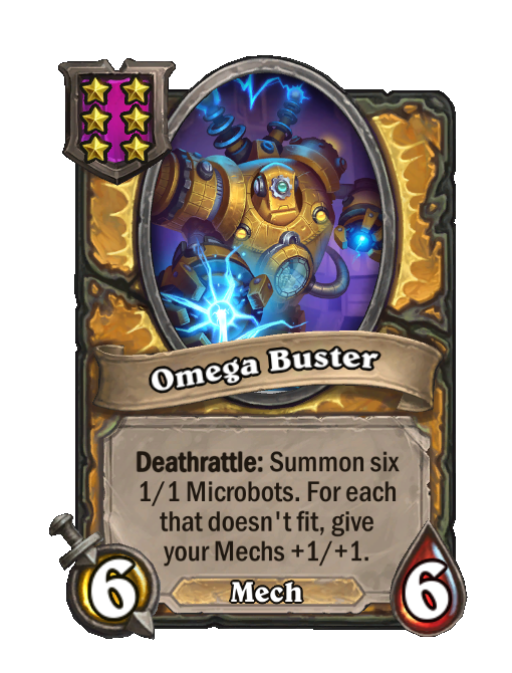 Omega Buster is a Tier 6 Mech Minion in Hearthstone Battlegrounds with 6/6 stats featuring Deathrattle. Effect: Deathrattle: Summon six 1/1 Microbots. For each that doesn't fit, give your Mechs +1/+1. This card is no longer in the pool (Legacy).