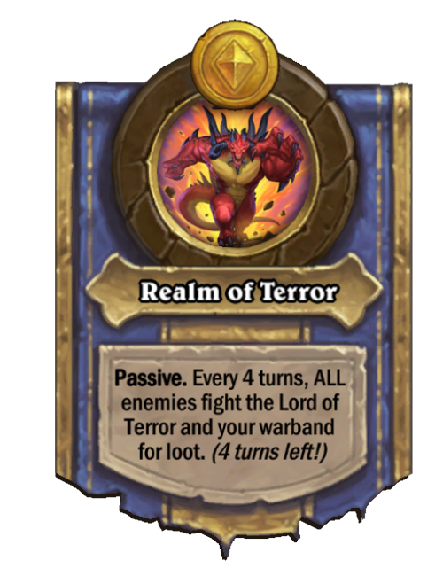 Realm of Terror is a Hero Power in Hearthstone Battlegrounds. Effect: Passive. Every 4 turns, ALL enemies fight the Lord of Terror and your warband for loot. (4 turns left!). Created by: Diablo. This card is no longer in the pool (Legacy).