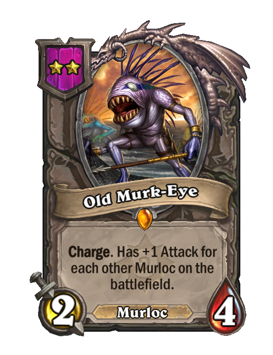 Old Murk-Eye is a Tier 2 Murloc Minion in Hearthstone Battlegrounds with 2/4 stats featuring Charge. Effect: Charge. Has +1 Attack for each other Murloc on the battlefield. This card is no longer in the pool (Legacy).
