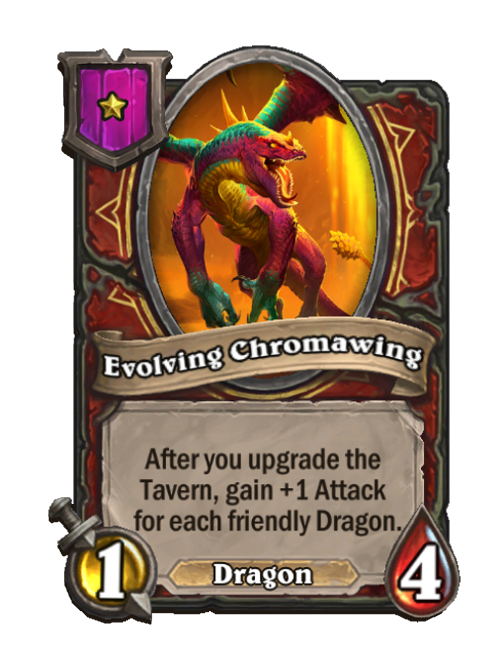 Evolving Chromawing is a Tier 1 Dragon Minion in Hearthstone Battlegrounds with 1/4 stats. Effect: After you upgrade the Tavern, gain +1 Attack for each friendly Dragon. This card is no longer in the pool (Legacy).