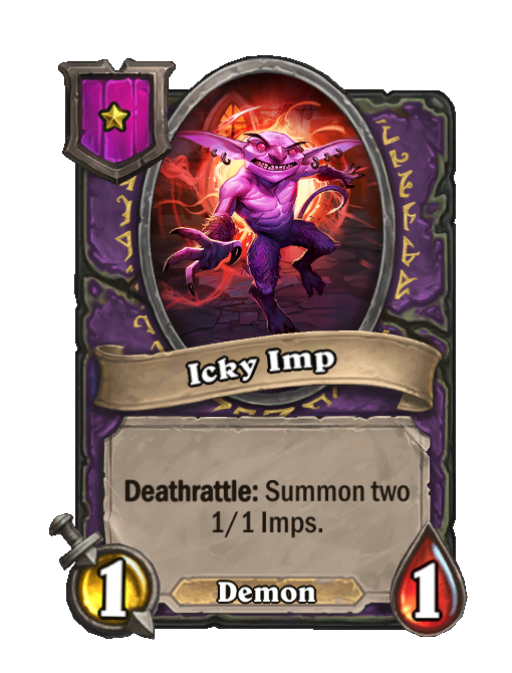 Icky Imp is a Tier 1 Demon Minion in Hearthstone Battlegrounds with 1/1 stats featuring Deathrattle. Effect: Deathrattle: Summon two 1/1 Imps. This card is no longer in the pool (Legacy).