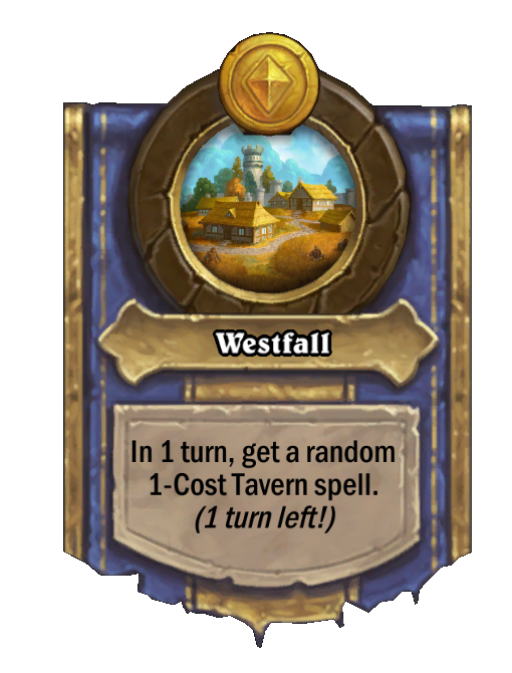 Westfall is a Hero Power in Hearthstone Battlegrounds. Effect: In 1 turn, get a random 1-Cost Tavern spell. (1 turn left!). Created by: Dungar's Gryphon.
