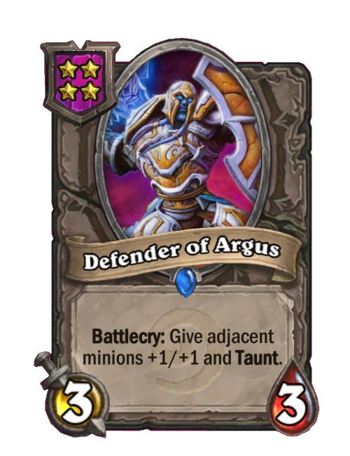 Defender of Argus is a Tier 4 Minion in Hearthstone Battlegrounds with 3/3 stats featuring Battlecry. Effect: Battlecry: Give adjacent minions +1/+1 and Taunt. This card is no longer in the pool (Legacy).