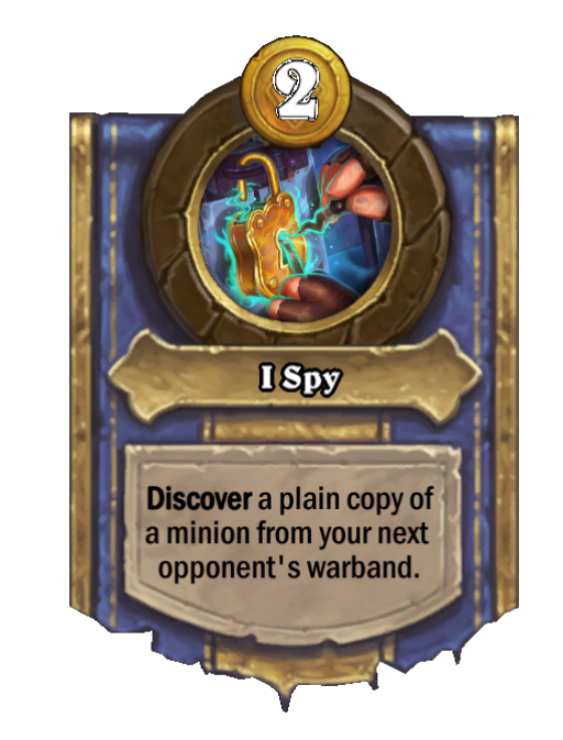 I Spy is a Hero Power in Hearthstone Battlegrounds featuring Discover. Effect: Discover a plain copy of a minion from your next opponent's warband. Costs 2 Gold. Created by: Scabbs Cutterbutter.