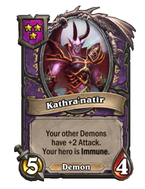 Kathra'natir is a Tier 3 Demon Minion in Hearthstone Battlegrounds with 5/4 stats. Effect: Your other Demons have +2 Attack. Your hero is Immune. This card is no longer in the pool (Legacy).
