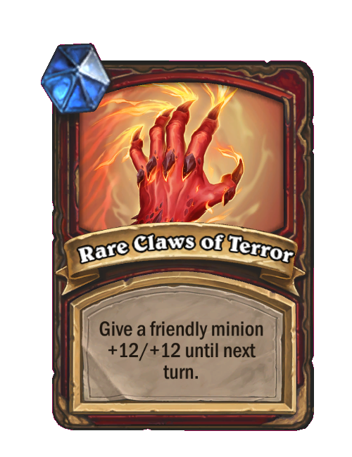 Rare Claws of Terror is a Spell in Hearthstone Battlegrounds. Effect: Give a friendly minion +12/+12 until next turn. Created by: Diablo, Lord of Terror. This card is no longer in the pool (Legacy).