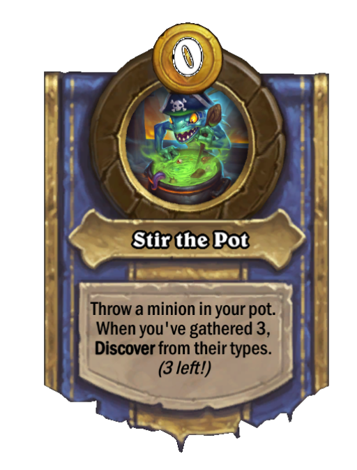 Stir the Pot is a Hero Power in Hearthstone Battlegrounds featuring Discover. Effect: Throw a minion in your pot. When you've gathered 3, Discover from their types. (3 left!). Created by: Cookie the Cook.