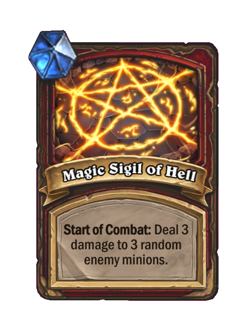 Magic Sigil of Hell is a Spell in Hearthstone Battlegrounds featuring Start of Combat. Effect: Start of Combat: Deal 3 damage to 3 random enemy minions. Created by: Diablo, Lord of Terror. This card is no longer in the pool (Legacy).