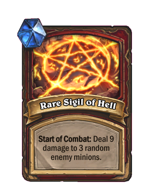 Rare Sigil of Hell is a Spell in Hearthstone Battlegrounds featuring Start of Combat. Effect: Start of Combat: Deal 9 damage to 3 random enemy minions. Created by: Diablo, Lord of Terror. This card is no longer in the pool (Legacy).