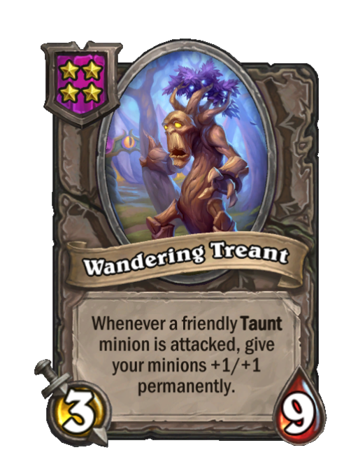Wandering Treant is a Tier 4 Minion in Hearthstone Battlegrounds with 3/9 stats. Effect: Whenever a friendly Taunt minion is attacked, give your minions +1/+1 permanently. Created by: Greybough.