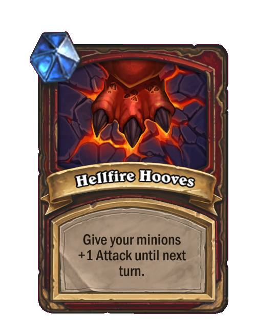 Hellfire Hooves is a Spell in Hearthstone Battlegrounds. Effect: Give your minions +1 Attack until next turn. Created by: Diablo, Lord of Terror. This card is no longer in the pool (Legacy).