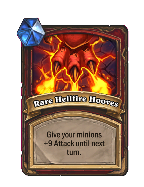 Rare Hellfire Hooves is a Spell in Hearthstone Battlegrounds. Effect: Give your minions +9 Attack until next turn. Created by: Diablo, Lord of Terror. This card is no longer in the pool (Legacy).