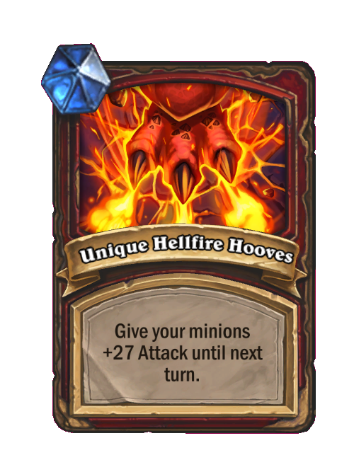 Unique Hellfire Hooves is a Spell in Hearthstone Battlegrounds. Effect: Give your minions +27 Attack until next turn. Created by: Diablo, Lord of Terror. This card is no longer in the pool (Legacy).