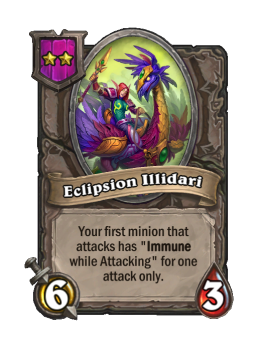 Eclipsion Illidari is a Tier 2 Minion in Hearthstone Battlegrounds with 6/3 stats. Effect: Your first minion that attacks has "Immune while Attacking" for one attack only. Created by: Illidan Stormrage.