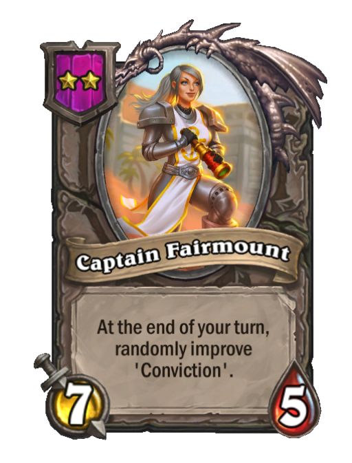 Captain Fairmount is a Tier 2 Minion in Hearthstone Battlegrounds with 7/5 stats featuring End of Turn. Effect: At the end of your turn, randomly improve 'Conviction'. Created by: Cariel Roame.