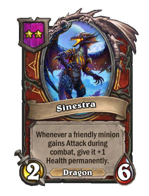 Sinestra is a Tier 2 Dragon Minion in Hearthstone Battlegrounds with 2/6 stats. Effect: Whenever a friendly minion gains Attack during combat, give it +1 Health permanently. Created by: Deathwing.