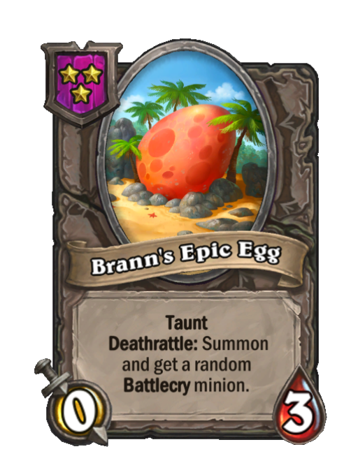 Brann's Epic Egg is a Tier 3 Minion in Hearthstone Battlegrounds with 0/3 stats featuring Taunt, Deathrattle. Effect: Taunt Deathrattle: Summon and get a random Battlecry minion. Created by: Dinotamer Brann.