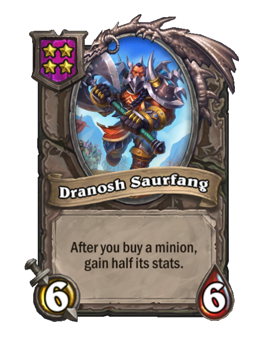 Dranosh Saurfang is a Tier 4 Minion in Hearthstone Battlegrounds with 6/6 stats. Effect: After you buy a minion, gain half its stats. Created by: Overlord Saurfang.