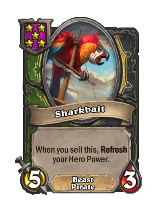 Sharkbait is a Tier 5 Beast/Pirate Minion in Hearthstone Battlegrounds with 5/3 stats featuring Refresh. Effect: When you sell this, Refresh your Hero Power. Created by: Skycap'n Kragg.