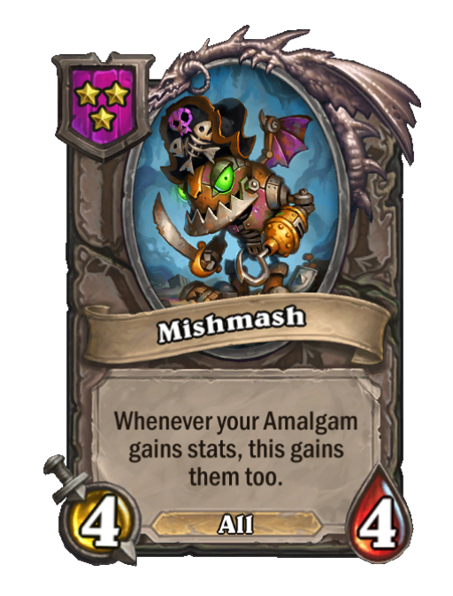 Mishmash is a Tier 3 All Minion in Hearthstone Battlegrounds with 4/4 stats. Effect: Whenever your Amalgam gains stats, this gains them too. Created by: The Curator.