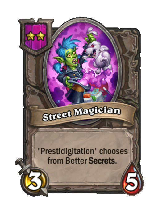 Street Magician is a Tier 2 Minion in Hearthstone Battlegrounds with 3/5 stats featuring Aura. Effect: 'Prestidigitation' chooses from Better Secrets. Created by: The Great Akazamzarak.
