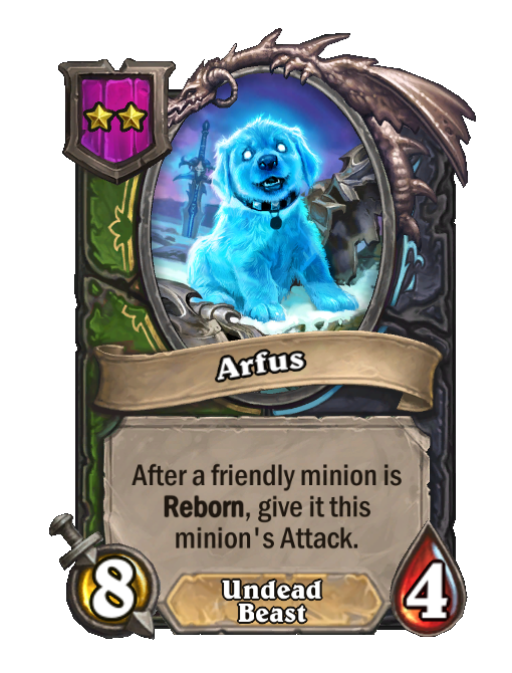 Arfus is a Tier 2 Undead/Beast Minion in Hearthstone Battlegrounds with 8/4 stats. Effect: After a friendly minion is Reborn, give it this minion's Attack. Created by: The Lich King.