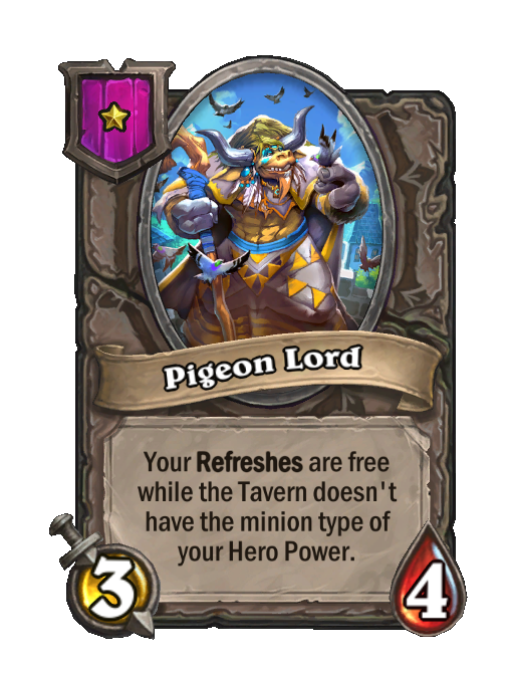 Pigeon Lord is a Tier 1 Minion in Hearthstone Battlegrounds with 3/4 stats featuring Aura. Effect: Your Refreshes are free while the Tavern doesn't have the minion type of your Hero Power. Created by: The Rat King.