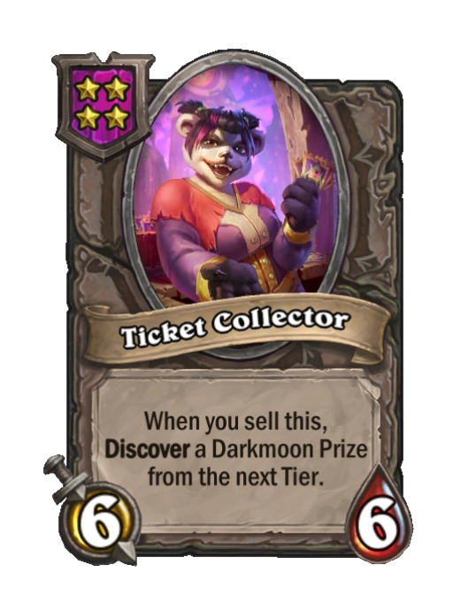 Ticket Collector is a Tier 4 Minion in Hearthstone Battlegrounds with 6/6 stats featuring Discover. Effect: When you sell this, Discover a Darkmoon Prize from the next Tier. Created by: Tickatus.