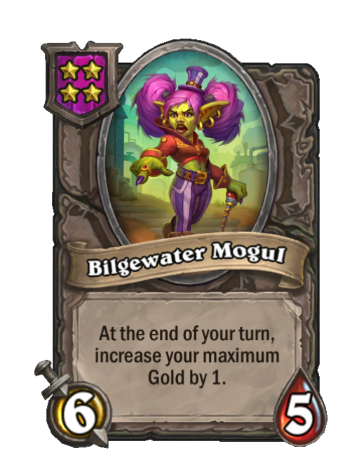 Bilgewater Mogul is a Tier 4 Minion in Hearthstone Battlegrounds with 6/5 stats featuring End of Turn. Effect: At the end of your turn, increase your maximum Gold by 1. Created by: Trade Prince Gallywix.