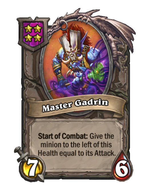 Master Gadrin is a Tier 4 Minion in Hearthstone Battlegrounds with 7/6 stats featuring Start of Combat. Effect: Start of Combat: Give the minion to the left of this ___Health equal to its Attack.__. Created by: Vol'jin.