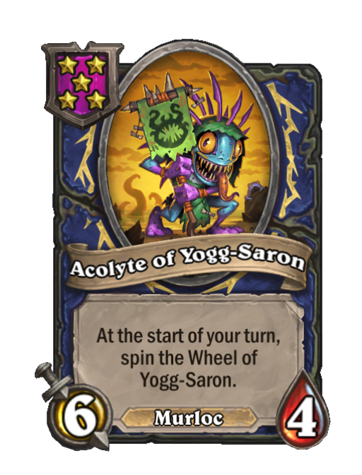 Acolyte of Yogg-Saron is a Tier 5 Murloc Minion in Hearthstone Battlegrounds with 6/4 stats featuring Start of Turn. Effect: At the start of your turn, spin the Wheel of Yogg-Saron. Created by: Yogg-Saron, Hope's End.