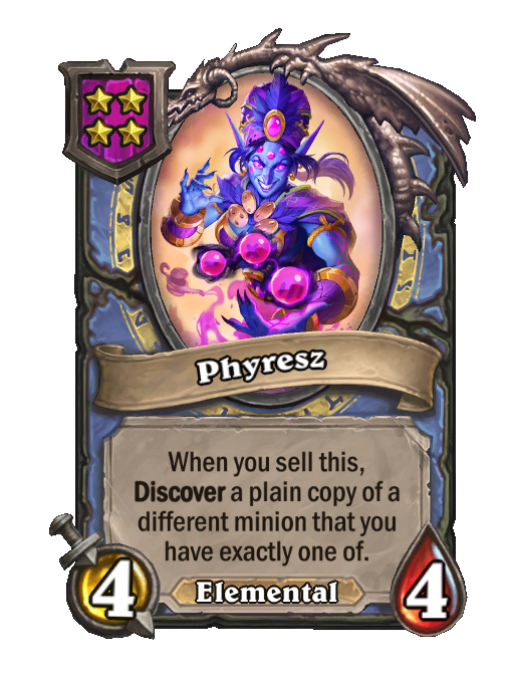 Phyresz is a Tier 4 Elemental Minion in Hearthstone Battlegrounds with 4/4 stats featuring Discover. Effect: When you sell this, Discover a plain copy of a different minion that you have exactly one of. Created by: Zephrys, the Great.