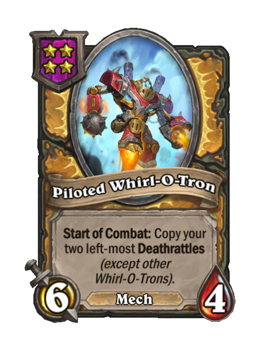 Piloted Whirl-O-Tron is a Tier 4 Mech Minion in Hearthstone Battlegrounds with 6/4 stats featuring Start of Combat. Effect: Start of Combat: Copy your two left-most Deathrattles (except other Whirl-O-Trons). Created by: Sneed.