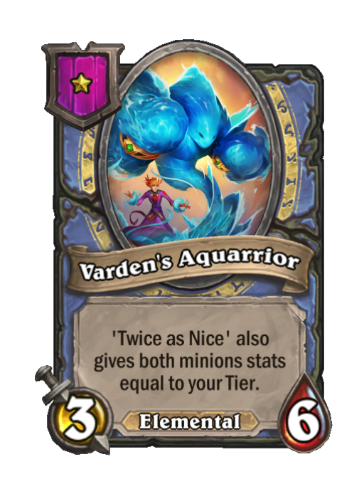 Varden's Aquarrior is a Tier 1 Elemental Minion in Hearthstone Battlegrounds with 3/6 stats. Effect: 'Twice as Nice' also gives both minions stats equal to your Tier. Created by: Varden Dawngrasp.